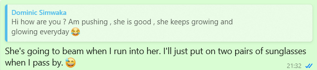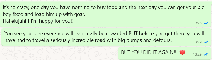 Ik merk dat zijn gezondheid en vooral zijn hoofdpijn niet in orde komen. Ik stuur hem een bericht in het Shona met daarin dat ik hem geld stuur. Geld dat hij enkel mag gebruiken om naar de dokter te gaan en medicijnen te kopen. Ik raad hem ook aan om eventueel een oogtest te laten doen, omdat hij maar met de hoofdpijn blijft zitten en niet naar het scherm van zijn gsm kan kijken.