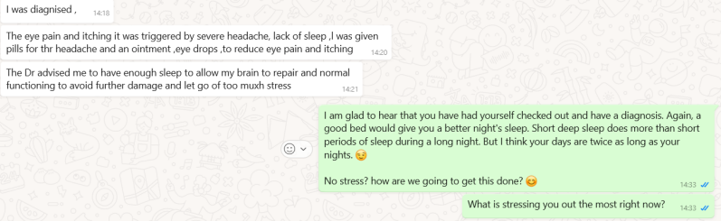 De dokter raadde hem aan om voldoende te slapen zodat zijn hersenen kunnen herstellen en normaal kunnen functioneren, om verdere schade te voorkomen en om te veel stress los te laten. Hoe ga je dat in zijn situatie klaarkrijgen? Onmogelijk!