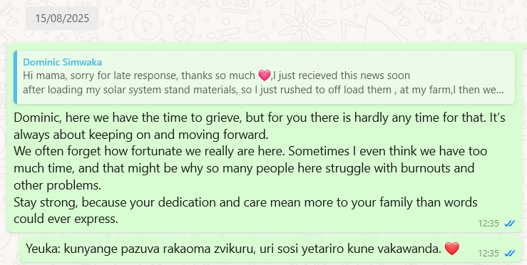 Tegen middernacht kreeg ik nog een bericht van Dominic. Hij vertelde dat hij het slechte nieuws net had ontvangen toen hij bezig was de materialen voor zijn zonnepanelen in te laden. Daarna haastte hij zich om deze materialen op zijn boerderij uit te laden. Vervolgens vulde hij een watertank van 200 liter, laadde brandhout en groenten in zijn truck – spullen die later bij de begrafenis zouden worden gebruikt.
