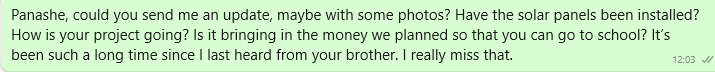 I’m actually relieved that through Panashe I can see there are solar panels — with the usual problems again, of course — but at least they are there or on the way, and that will be a huge benefit for our Dominic.